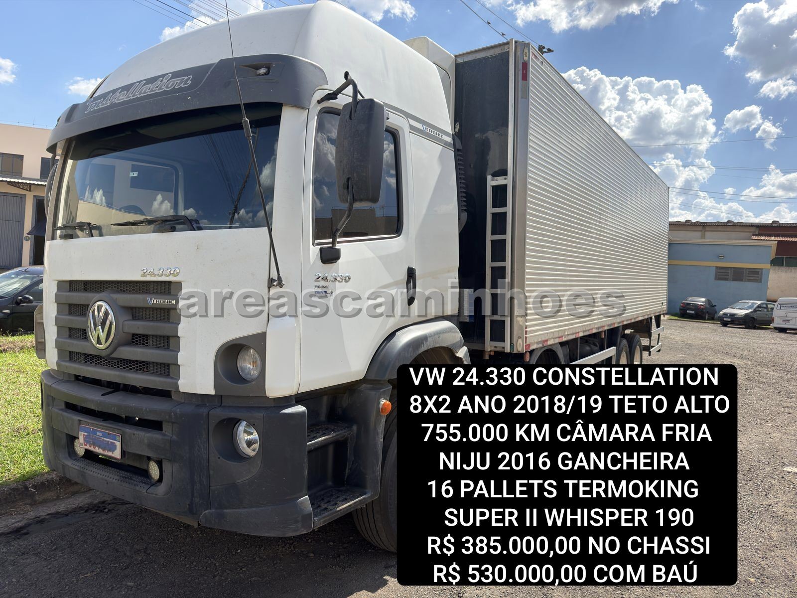 VOLKSWAGEN 24.330 8X2 CONSTELLATION ANO 2028/19, TETO ALTO, 755.000 KM. CÂMARA FRIA NIJU ANO 2016, ASSOALHO FRISADO, GANCHEIRA, 16 PALLETS, TERMOKING SUPER II WHISPER 190. R$ 385.000,00 NO CHASSI R$ 530.000,00 COM CÂMARA FRIA